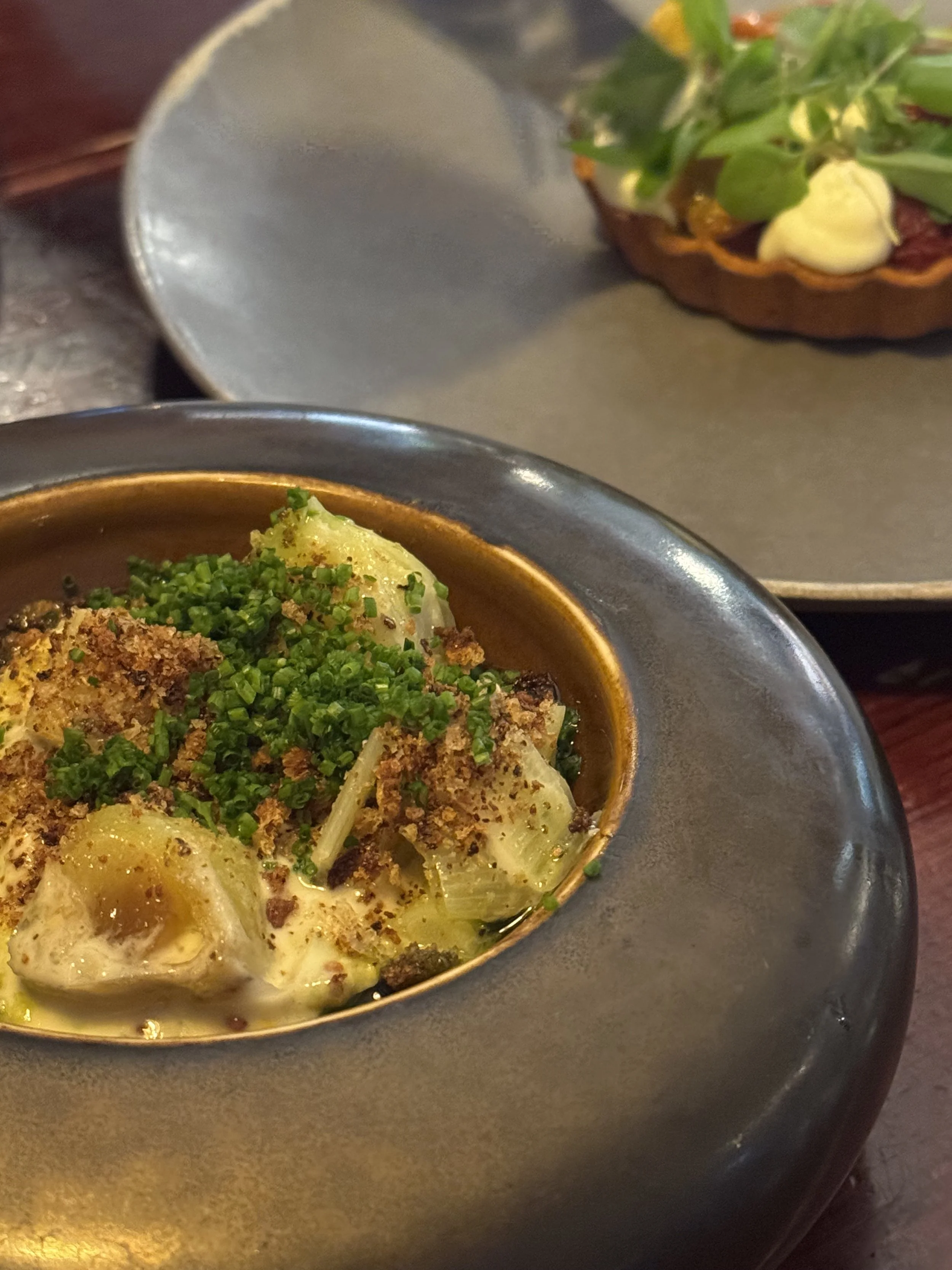 There’s a subtle elegance to it all — thoughtful plates that feel both classic + fresh, pared-back interiors, the hum of conversation rising gently above the clink of cutlery. The menu leans French, yes, but it’s also unmistakably them — precise, seasonal, full of feeling.