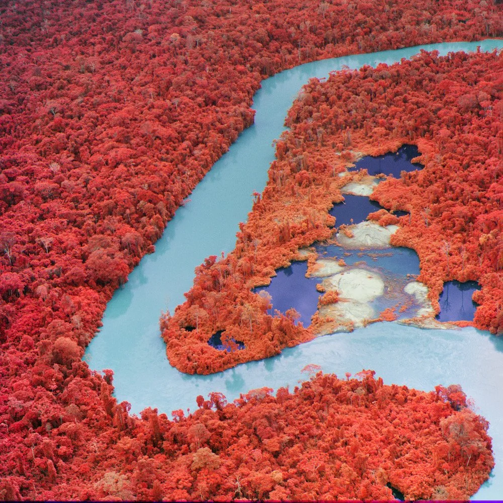 In understanding Mosse’s work, his project, The Enclave — a photographic series that documents the brutal conflict in the Democratic Republic of Congo, through the use of infrared film — captures both the surreal beauty + the devastating human impact of the war. The lush, vibrant colors in his infrared photographs in general create a surreal landscape that contrasts sharply with the devastating cost of war on humankind. His ability to show both the beauty of the land along with the horror of its destruction speaks to his profound understanding of how landscapes shape, + are shaped by, human conflict. Along with his work on the effects of war, Mosse delves into the environmental crisis facing one of the world’s most vital ecosystems, the Amazon Rainforest. Using his signature infrared film here again, he captures the dense, vibrant forests in hauntingly beautiful images that contrast the natural splendor of the Amazon with the looming threat of deforestation + exploitation. Mosse's work in the region, like much of his art, is not just about the visual allure of the landscape but also a poignant commentary on the destructive forces impacting the environment. His images invite viewers to reflect on the fragile relationship between nature + human activity, offering a profound, urgent perspective on the need to protect these irreplaceable ecosystems.